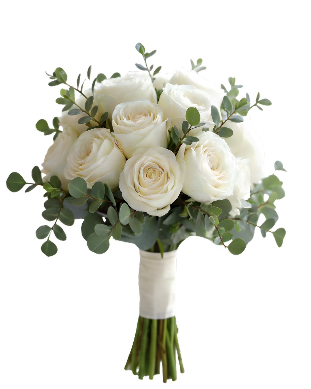 Buquê clássico de rosas-brancas envoltas por folhagens verdes, com acabamento delicado no cabo — elegante, puro e sofisticado.