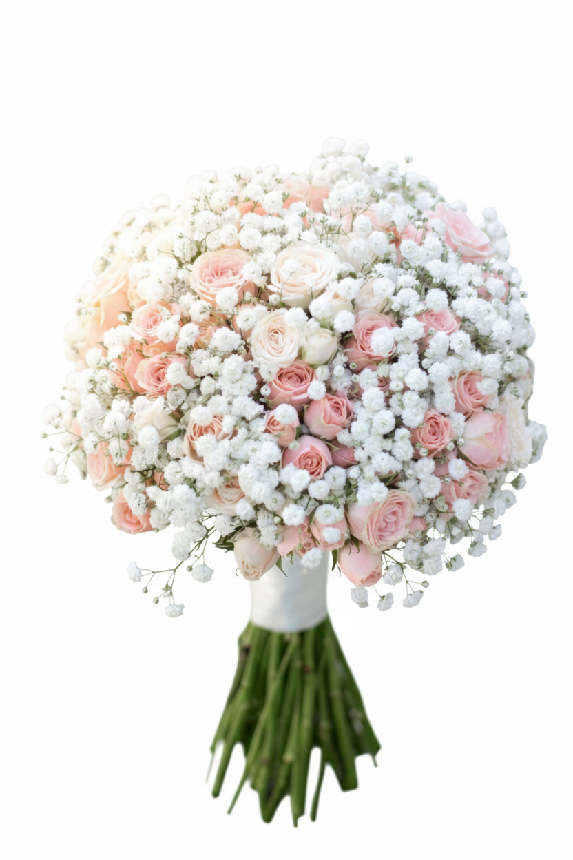 Buquê delicado e romântico, composto por rosas em tons suaves de rosa envolvidas por nuvens de mosquitinho branco, criando um visual leve, elegante e atemporal — perfeito para celebrar o amor com doçura e sofisticação. Reserve com antecedência para assegurar disponibilidade na data desejada.