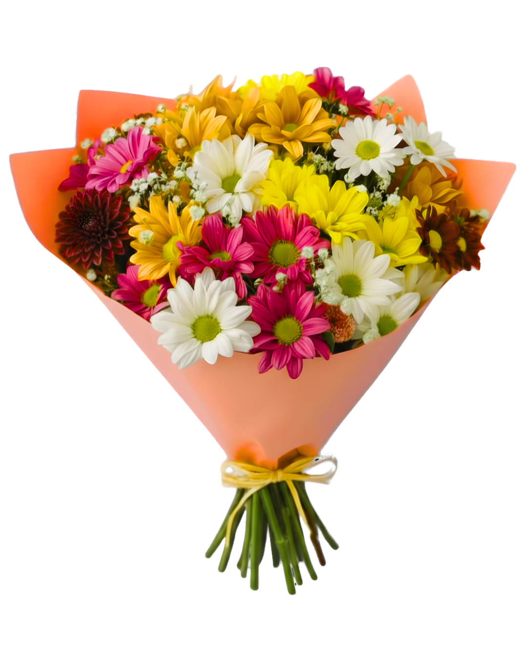 Este buquê é uma composição vibrante de margaridas e mini crisântemos, selecionados em uma paleta solar e radiante. Com flores em branco puro, amarelo intenso e magenta, o arranjo ganha um toque de delicadeza extra com os detalhes em "chuva-de-prata" (gipsofilas) e/ou aster mariano entre as pétalas.